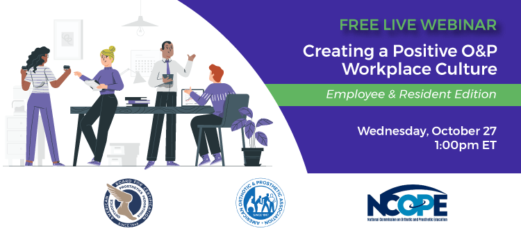Employers and supervisors are not the only ones responsible for the culture of a workplace, employees have a role to play too. If you are a resident or employee and want to learn more about how you can make an impact on your organization’s culture, attend the FREE Creating a Positive O&P Workplace Culture Webinar, Wednesday, October 27 at 1pm ET.