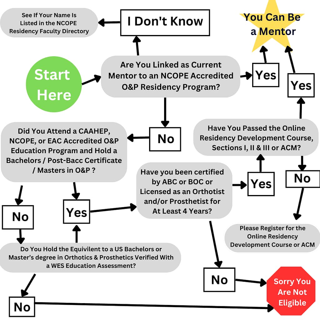 The requirements to serve as a residency director or mentor are listed in the 2025 NCOPE Residency Standards under Standard IV. The requirements include a combination of education, post-certification/licensure experience, and completion of either the Online Residency Program Development Course sections I, II & III or the Approved Clinical Mentor (ACM) course within the last 3 years.