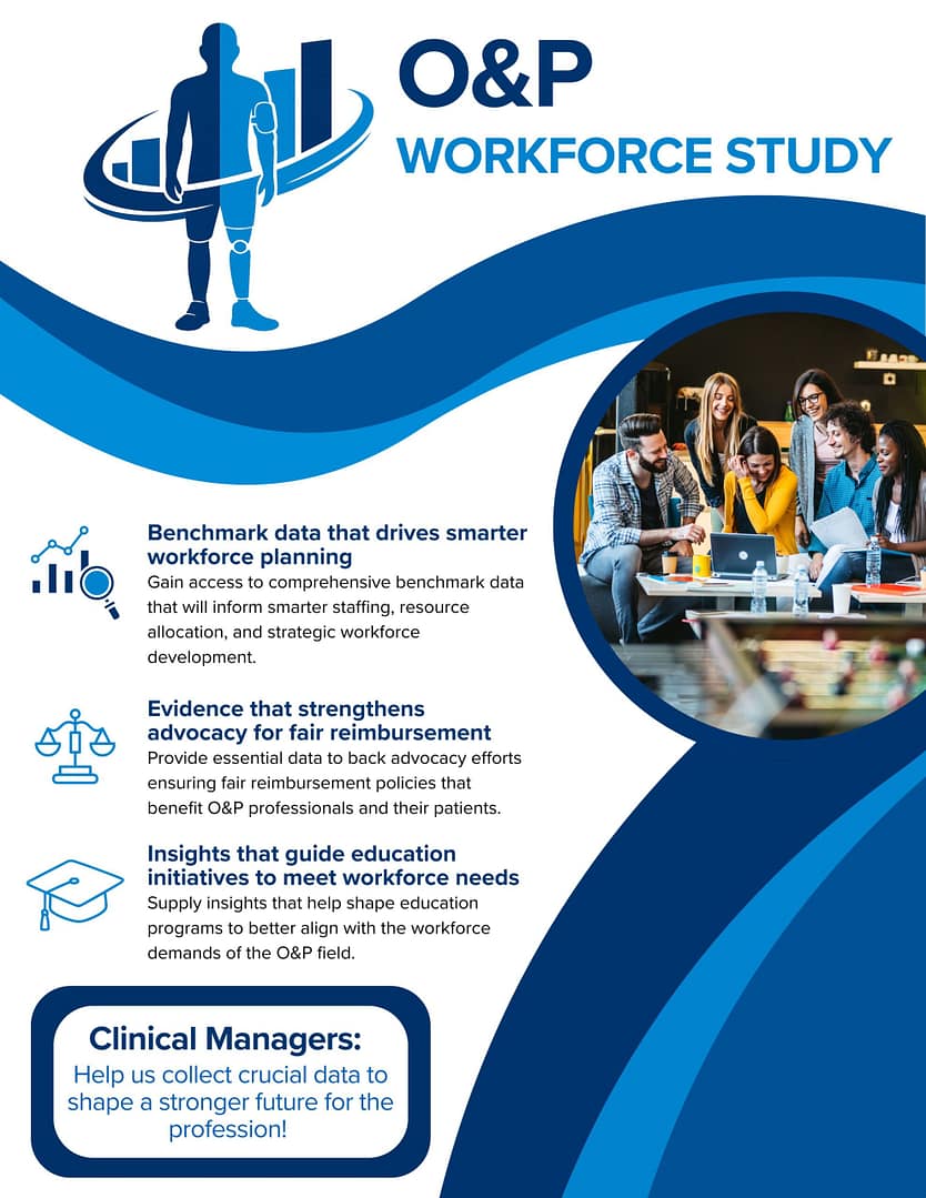 Purpose of the O&P Workforce Study: The focus is on having the right people with the right skills in the right places at the right time. The workforce study aims to identify benchmarks for orthotist-prosthetists, assistants, fitters, and technicians based on workflow and demand for services.